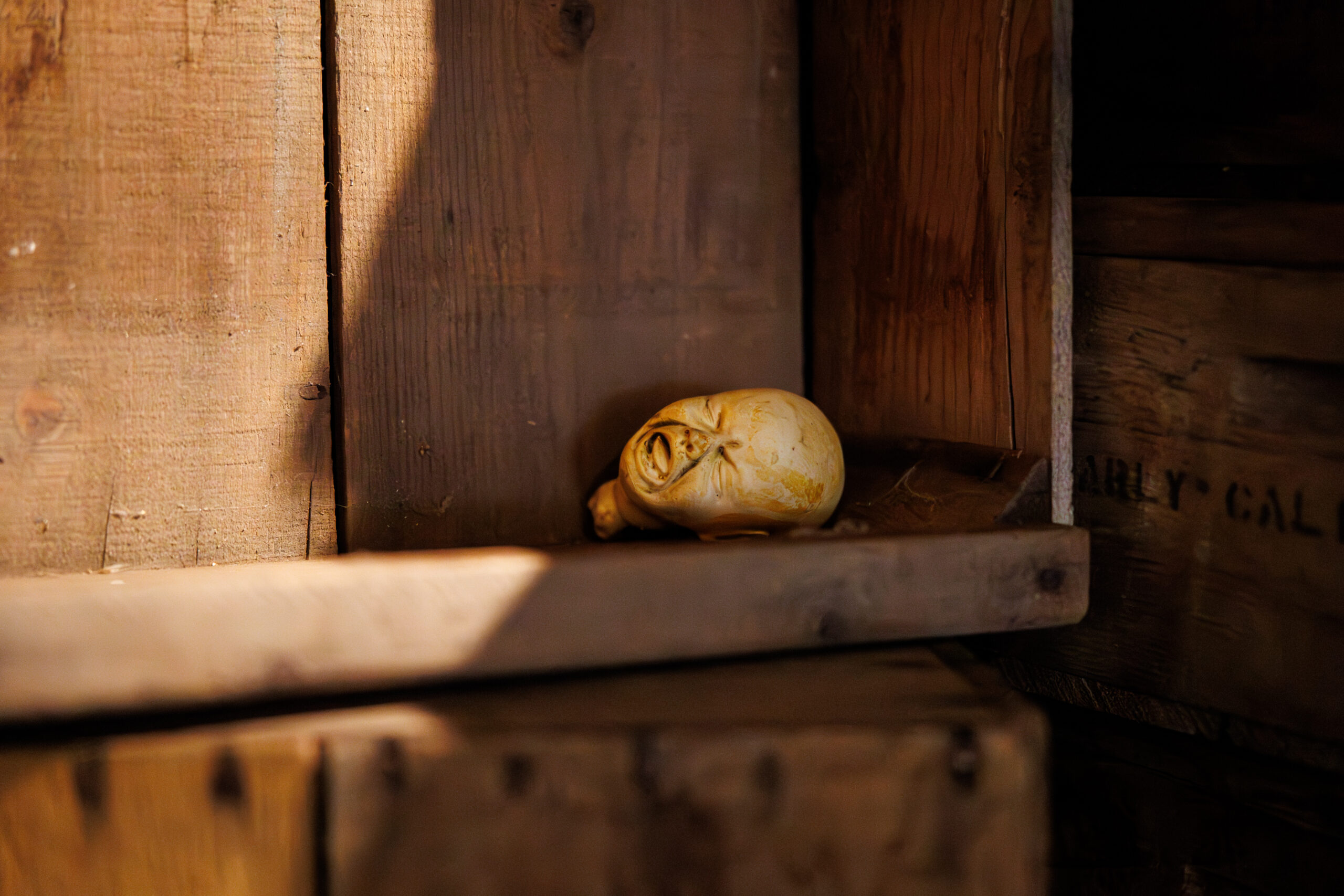 Across the painting and in the left corner, lies a display of crates and ceramic sculptures of heads varying in size. The heads each display expressions of anguish with a few inhabiting skyscrapers and poles sticking out of their eyes and face. The piece is situated in the Back Gallery, with the theme being climate change.