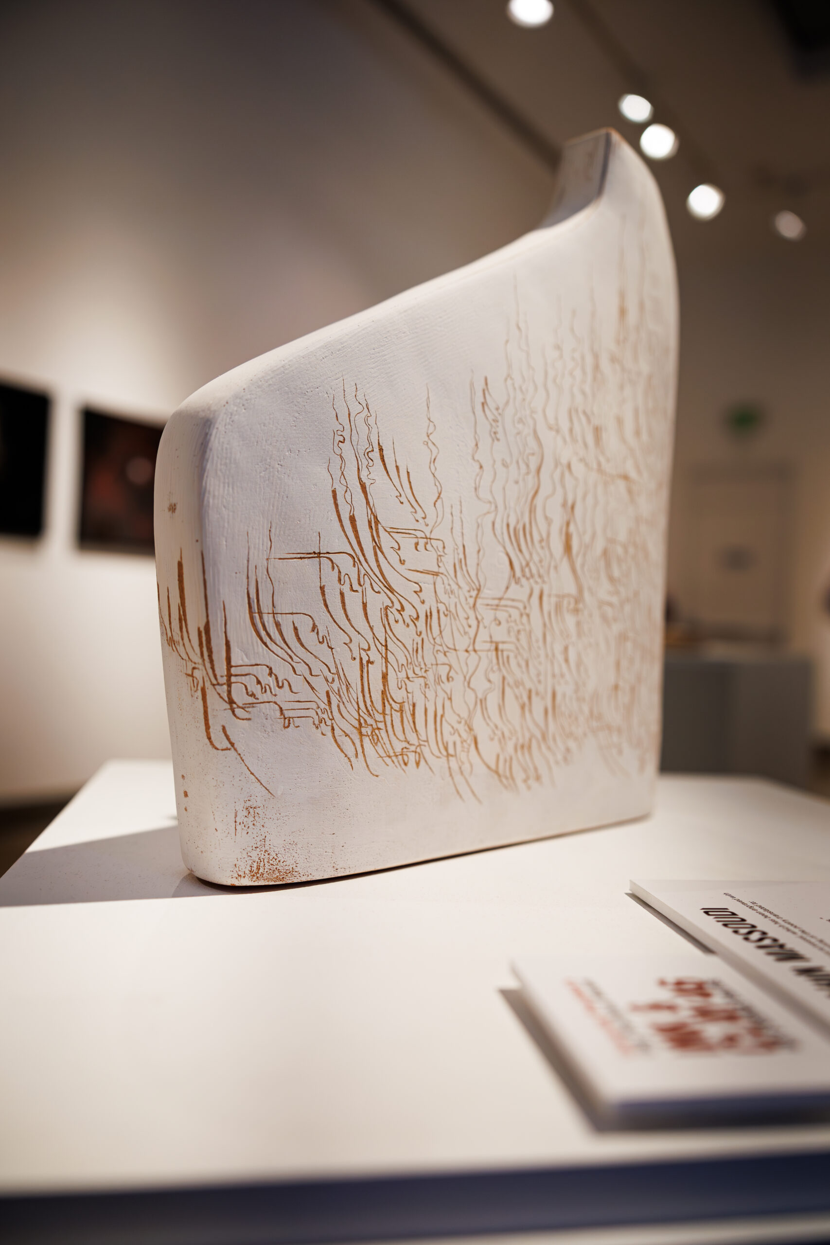 Amid a crowded gallery filled with artists and art lovers alike, sits a clay “vessel,” “Mehr 1” by Shahin Massoudi. Unbalanced in shape, plain in color, only to be adorned with Persian calligraphic script.