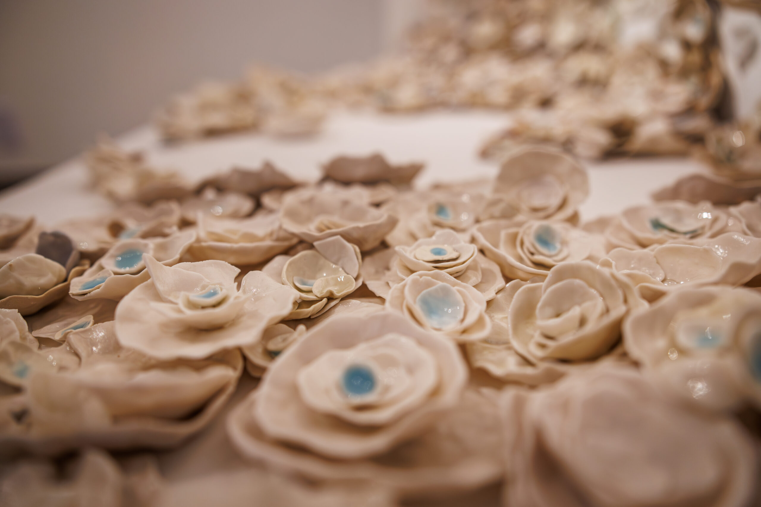 In the West Gallery, the collection exhibits the theme of climate change and its effects, specifically erosion and the relationship between Earth and water. From the floor to the ceiling, the corner of the gallery is enveloped with delicate and light hand-pinched shells. But what it represents is something far heavier.