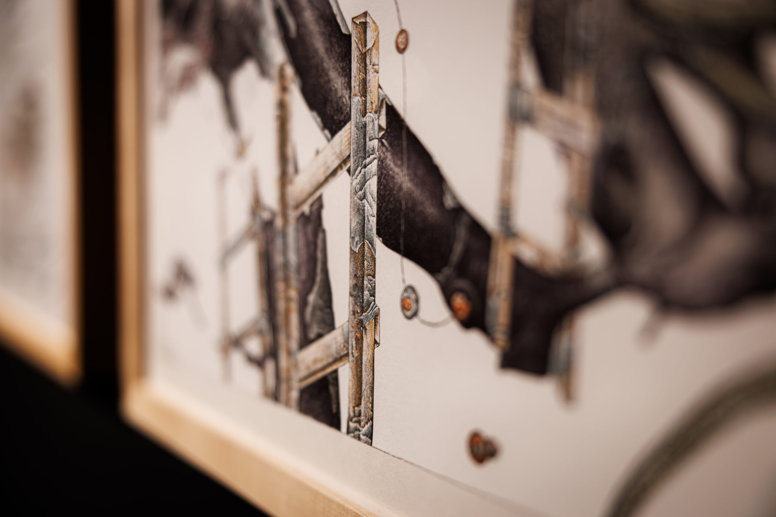 Chaput also used articles of clothing, socks and shoelaces found along the border to create the sparse and erratic marks within the painting. The biomorphic gray encapsulating the ladders was a representation of his abstract feelings toward the border.