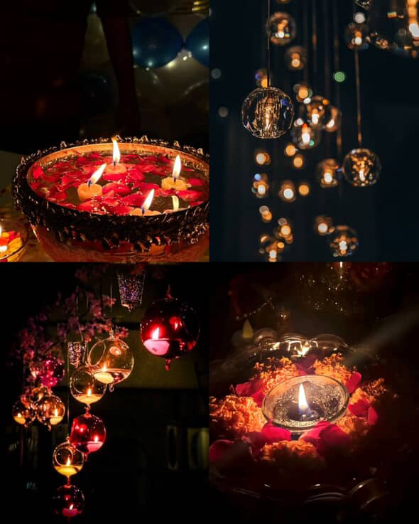 Leading up to the Diwali celebration, people shop for their families, prepare food and desserts, and decorate their houses. Some popular foods include chirote, karanji, and samos. Decorations consist of firecrackers, fairy lights, candles and diyas.