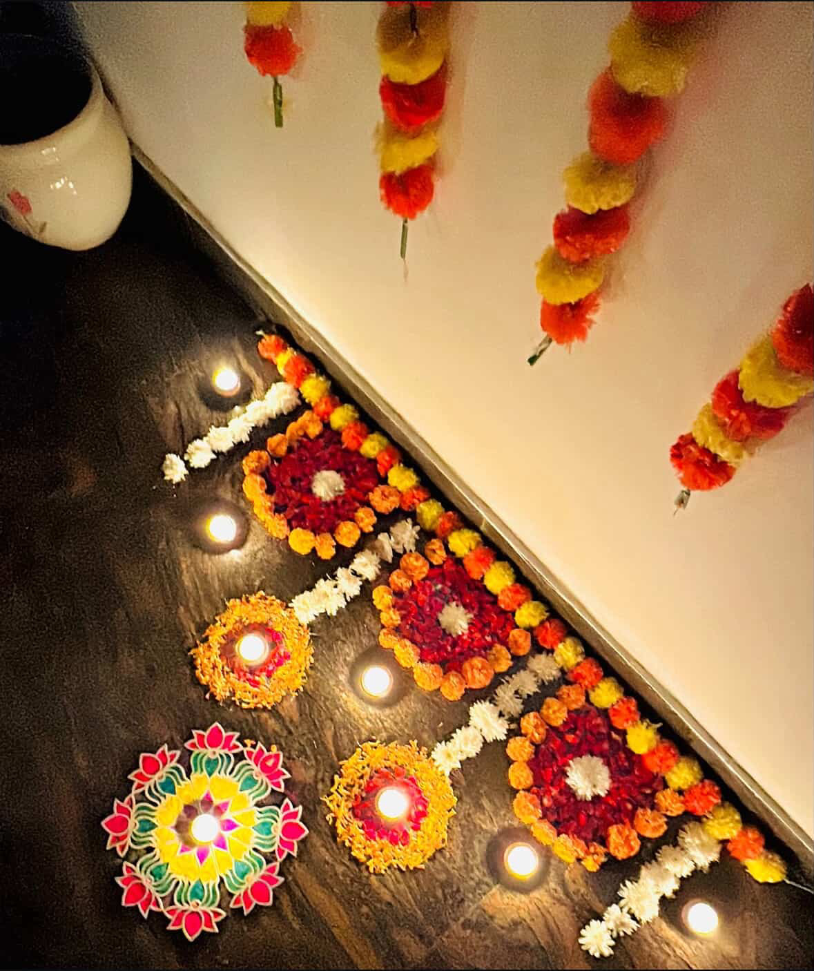 Houses are decorated with rangolis, which are drawings made of colored rice, sand or flower petals to summon the goddess Lakshmi to bless their home with wealth and success.